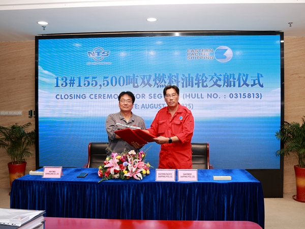 On August 25, 2025, the closing ceremony for 13# 155,500 DWT LNG Dual Fuel Crude Oil Tanker bearing Hull No.0315813 was held at the meeting room on 8th floor of New Times Office Building. The company's Chief Executive Officer Mr. Liu Haijin, Executive Deputy General Manager Mr. Zhang Yuyong and the owner's representatives Mr. Dino Vilicic and Mr. Ni Jie were present. The vessel was smoothly and successfully delivered by us and accepted by the Owner EPS.