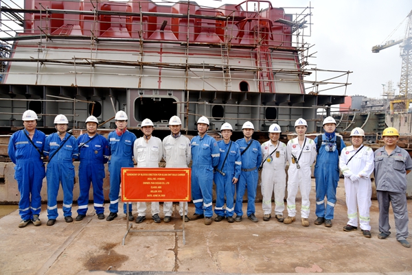 On June 24, 2020, the block erection ceremony of No.3 63,500 DWT Bulk Carrier was carried out at the No.1 dry dock of NTS. Our Assistant of General Manager Mr. Xu Zhenyu and representatives from the owner Pan Ocean Co., Ltd. and ABS classification society attended this event.