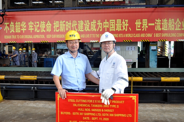 On September 11, 2020 , the Steel Cutting Ceremony of two units of 50,000 DWT Product Oil/Chemical Tankers (IMO Type 2) with Hull Nos.0405026 and 0405027 has been carried out successfully by New Times Shipbuilding Co., Ltd. Our CEO Mr. Liu Haijin and representatives from the owner, DNV-GL Class and CCS Class attended and witnessed the ceremony together.