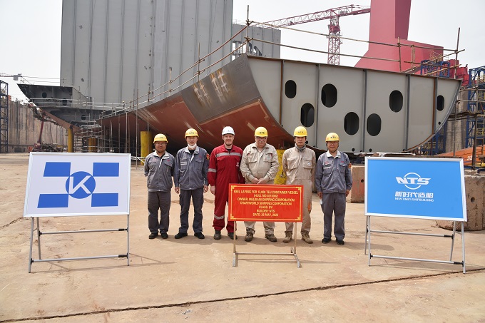 On May 26, 2023, the keel laying ceremony of one 13,000 TEU Container Vessel bearing builder's hull no.0213002 has been carried out successfully by New Times Shipbuilding Co., Ltd.. Our Production Manager Mr. Chen Yuefeng, the representatives from Chartworld Site Manager Mr. Jagor Kalinic and the representatives from BV classification society attended and witnessed this event.
