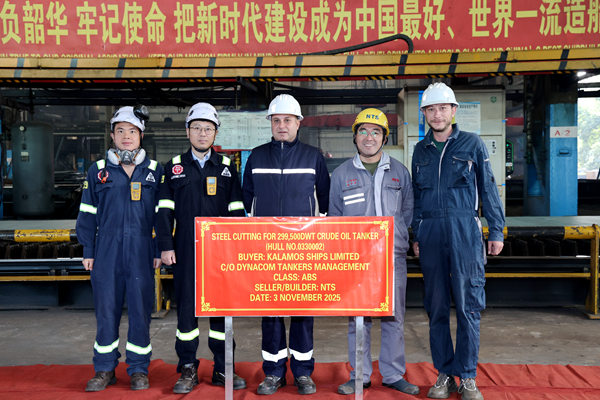 On November 3, 2025, the steel cutting of 2# 299,500 DWT Crude Oil Tanker bearing builder's hull no.0330002 was carried out successfully by New Times Shipbuilding Co., Ltd.. The representatives from shipyard, Dynacom Site Team and ABS classification society attended and witnessed this event.