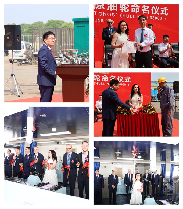 On 26 June, 2025, we held naming ceremony for one 299,500 DWT Crude Oil Tanker with Builder's Hull No.0330001. Our Executive Deputy General Manager Mr. Zhang Yuyong, General Manager Assistant Mr. Xu Zhenyu, Dynacom site manager Mr. Romeo Mustata, ABS site manager Mr. Cao Wei and other VIP guests attended this ceremony.