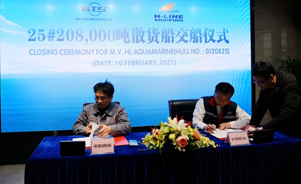 On February 10, 2021, the closing ceremony for 25# 208,000 DWT Bulk Carrier was held at the meeting room on 8th floor of New Times Office Building. Our CEO Mr.Liu Haijin, Executive General Manger Mr. Zhang Yuyong and the representive from H-Line Shipping Co., Ltd. Mr. Young Hwan Lee attended this ceremony. The vessel was smoothly and successfully delivered by us and accepted by H-Line, which also indicates that the five units of 208,000 DWT Bulk Carriers ordered by H-Line Shipping Co., Ltd. in our company has all been completed and delivered on schedule.