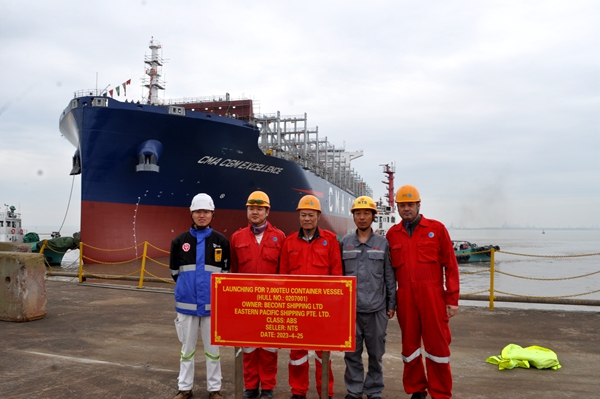 On April 25, 2023, the launching ceremony of one 7,000 TEU Container Vessel bearing builder's hull no.0207001 has been carried out successfully by New Times Shipbuilding Co., Ltd. Our Executive Deputy General Manager Mr. Zhang Yuyong, the representatives from EPS site team and representatives from ABS classification society attended and witnessed the ceremony together.