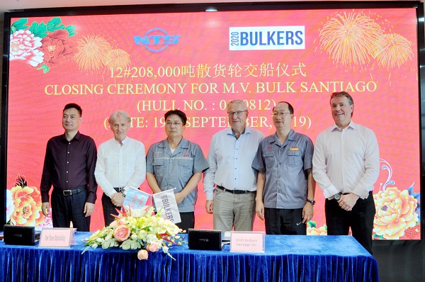 On September 19, 2019, the closing ceremony for 12# 208,000 DWT Bulk Carrier was held at the meeting room on 8th floor of New Times Office Building. Our CEO Mr.Liu Haijin, Executive General Manger Mr. Zhang Yuyong and the representative from 2020 Bulkers Ltd. attended this ceremony. The vessel was smoothly and successfully delivered by us and accepted by the Buyer.