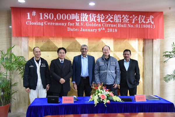 On January 9, our CEO Mr. Liu Haijin, Executive General Manger Mr. Zhang Yuyong and Mr. JS Narayanan, representative of Bermuda Shipowner GOLDEN OCEAN, attended the closing ceremony of the No.1 180,000 DWT Bulk Carrier, witnessing the signing and delivery of the ship, and this moment marks that New Times Shipbuilding Co., Ltd has totally delivered 300 vessels with a total deadweight of 28.34523 million tons since 1997 after the success delivery of the first local 10,000 tonner shipbuilding.