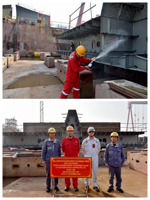 On November 4, 2024, the keel laying of one 50,000 DWT Chemical/Product Oil Tanker bearing builder's hull no.0405055 has been carried out successfully by New Times Shipbuilding Co., Ltd. The representatives from EPS Site Office, ABS classification society and shipyard attended and witnessed the ceremony together.