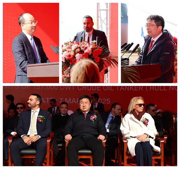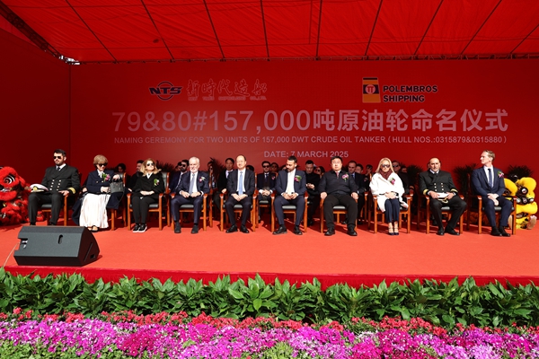 7日上午,79#80#157000噸油船命名儀式在新區(qū)碼頭舉行,常務(wù)副總經(jīng)理張玉永主持,總經(jīng)理劉海金、副總經(jīng)理袁衡與希臘船東Polembros Shipping Limited公司代表Polemis Leonidas、George Vakirtzis及兩位教母Irene Glypti、Katerina Helioti、LR船級社代表等嘉賓一起出席活動。儀式上,總經(jīng)理劉海金致辭,他說:新時代造船擁有豐富的蘇伊士油船設(shè)計和建造經(jīng)驗,我們在這兩艘傳統(tǒng)動力油船上也運用了大量節(jié)能減排技術(shù),盡可能地降低碳排放以確保該船型在市場上保持領(lǐng)先地位,相信新船的加入將給Polembros公司帶來無盡的財富,感謝Polembros公司的信任,我們將一如既往地提供最優(yōu)質(zhì)的產(chǎn)品和服務(wù),感謝駐廠船東、船檢團(tuán)隊及各合作方的大力支持,正是他們與NTS員工的不懈努力和付出創(chuàng)造了成功。船東代表Polemis Leonidas也對所有辛勤工作的合作伙伴表示了感謝,并闡述了兩船名稱的含義,祝愿兩船開啟新的輝煌旅程。