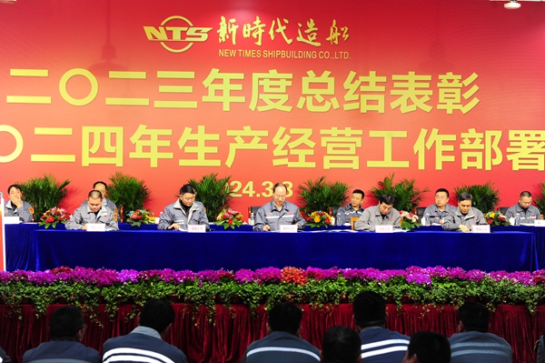 常務(wù)副總經(jīng)理張玉永主持大會(huì),他指出,2023年,我們?cè)诠径聲?huì)、黨委和經(jīng)營層的正確領(lǐng)導(dǎo)下,強(qiáng)管理,促生產(chǎn),交出了一份含金量滿滿的答卷。今天我們新時(shí)代造船人隆重舉行“二〇二三年度總結(jié)表彰暨二〇二四年生產(chǎn)經(jīng)營工作部署會(huì)”,主要目的是總結(jié)2023年工作,表彰先進(jìn)典型;部署2024年任務(wù),動(dòng)員公司上下樹立榜樣力量,以嶄新的姿態(tài)、飽滿的熱情、務(wù)實(shí)的作風(fēng),接續(xù)奮斗、奮勇前行,全面提升公司各項(xiàng)管理工作,奮力譜寫新時(shí)代高質(zhì)量發(fā)展新篇章,把新時(shí)代造船打造成世界一流的百年造船企業(yè)。