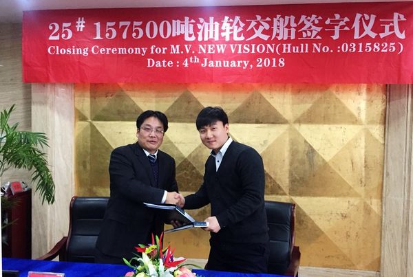 1月4日下午,公司在八樓會議室舉行簽字交船儀式,常務副總經(jīng)理張玉永與25#158000噸油船代表共同簽署交船文件,25#158000噸油船正式交付船東,公司迎來交船新年開門紅。