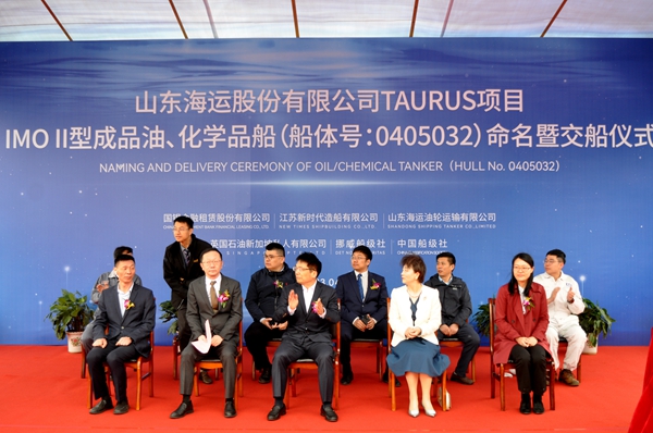 在喜慶的氣氛中,教母郭萍將32#50000噸Ⅱ類化學(xué)品船命名為“CL AGATHA CHRISTIE”號(hào),并祝愿新船一帆風(fēng)順。儀式上,常務(wù)副總經(jīng)理張玉永對(duì)在船舶建造過程中辛勤付出的山東海運(yùn)油輪運(yùn)輸公司團(tuán)隊(duì)、駐廠監(jiān)造團(tuán)隊(duì)、DNV和CCS船級(jí)社及公司全體員工表示衷心地感謝和崇高的敬意。山東海運(yùn)油輪運(yùn)輸公司董事長(zhǎng)徐濤表示,將以此次船舶命名為契機(jī),戮力同心、篤行致遠(yuǎn),攜手締造更多共商共贏、互利互惠的豐碩成果。