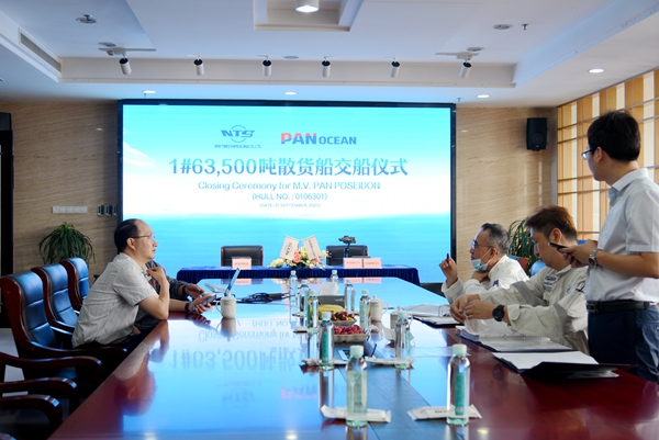 總經(jīng)理劉海金、常務(wù)副總經(jīng)理張玉永與韓國(guó)船東Pan Ocean Co., Ltd.代表共同出席活動(dòng),1#63500噸散貨船成功交付。