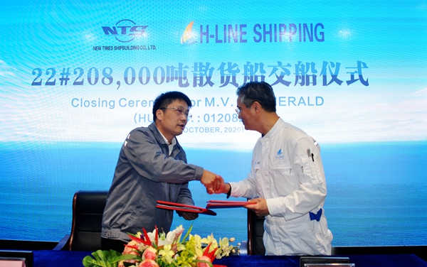 韓國船東H-Line Shipping Co., Ltd.在我們企業(yè)訂有5艘208000噸散貨船,此次交付的是該系列船中的第二艘 。
