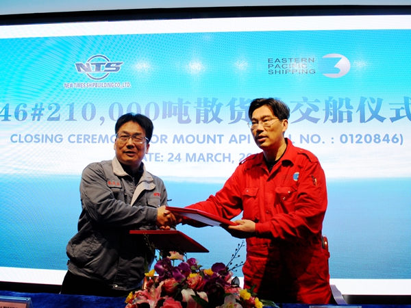 3月24日上午,公司在辦公樓八樓會議室舉行船舶交付簽字儀式,46#210000噸雙燃料動力散貨船成功交付船東Eastern Pacific Shipping Pte. Ltd.(EPS)公司運營。