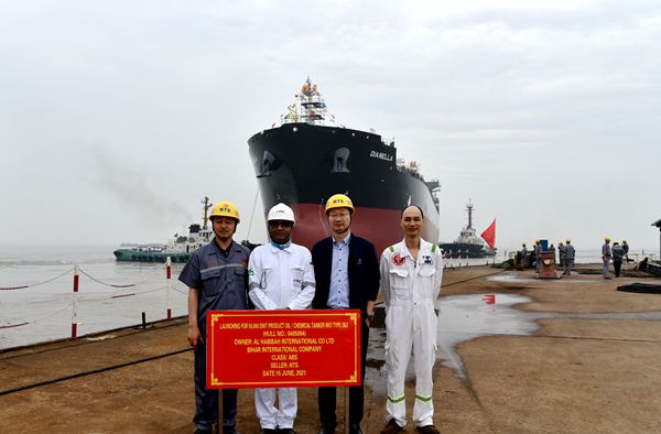 6月15日清晨,公司1# 塢區(qū)域內(nèi),4#5#50000噸化學(xué)品/油船靜靜地漂浮在船塢內(nèi),等待著下水工作開始。總經(jīng)理劉海金、常務(wù)副總經(jīng)理張玉永與船東沙特BIHAR INTERNATIONAL COMPANY的代表、ABS船級社代表等嘉賓也早早地來到生產(chǎn)現(xiàn)場,觀看船舶下水過程。