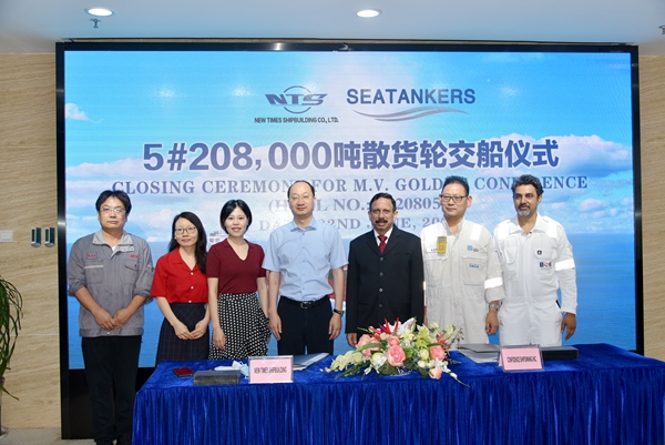 6月22日上午,公司在辦公樓八樓會議室舉行5#208000噸散貨船交船簽字儀式,總經(jīng)理劉海金、常務副總經(jīng)理張玉永和船東SEATANKERS公司代表A.C.Caeiro先生等嘉賓一起出席活動。儀式上,常務副總經(jīng)理張玉永與船東SEATANKERS公司代表A.C.Caeiro先生共同簽署交船文本,5#208000噸散貨船正式交付船東。