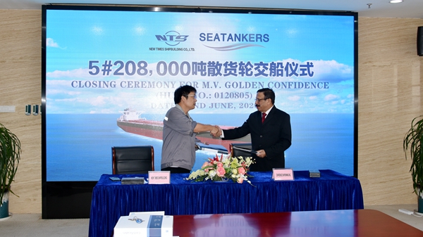 挪威船東SEATANKERS公司在我們企業(yè)共訂制了6艘208000噸散貨船,此次交付使用的是最后一艘。該公司還在我司建造過6艘180000噸散貨船、8艘111000噸成品油船和8艘158000噸原油船,己全部交付使用。