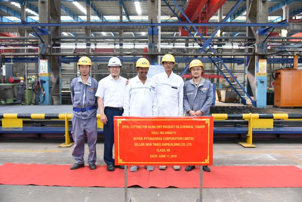 5月7日上午9點(diǎn)38分,首制船8#9#50000噸化學(xué)品船在東區(qū)鋼加車間隆重開工,公司總經(jīng)理助理徐震宇、N8船東公司代表、KR船級社代表及公司相關(guān)人員參加開工點(diǎn)火儀式。N8船東現(xiàn)場經(jīng)理庫馬親自點(diǎn)火,50000噸化學(xué)品船r的第一塊鋼板開始切割下料。