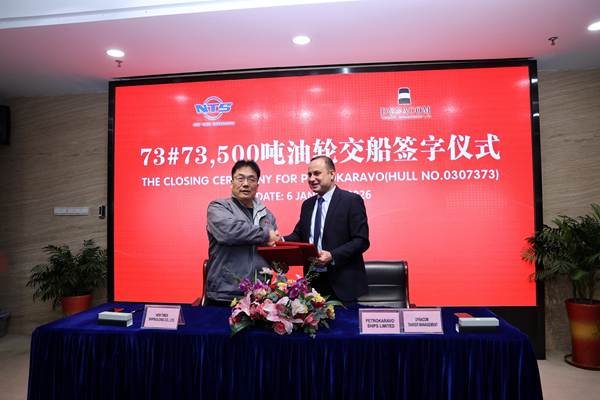 1月6日上午,公司在辦公樓八樓會議室舉行船舶簽字交付儀式,73#73500噸油船交付希臘船東Dynacom運(yùn)營,奏響了新年“開門紅”,2026年度生產(chǎn)經(jīng)營工作再啟新征程。