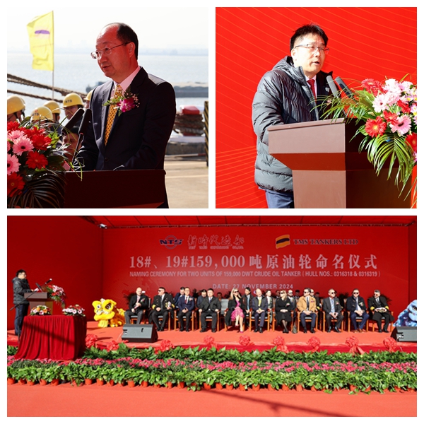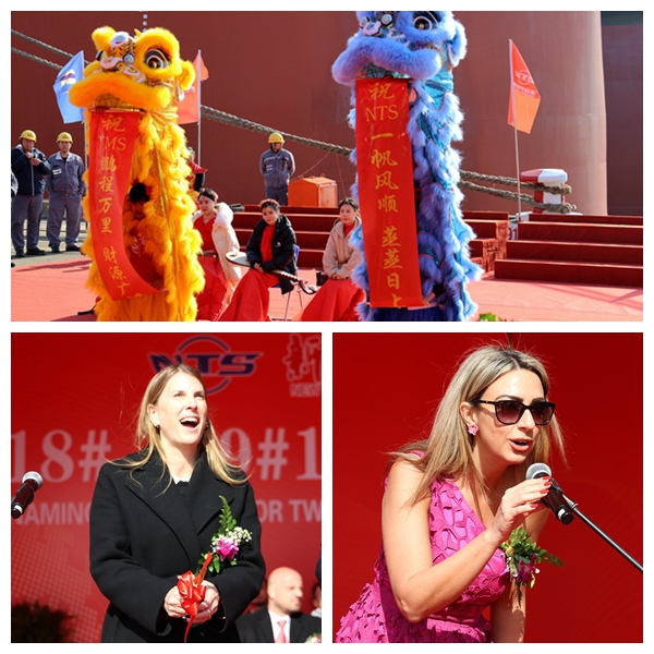 總經(jīng)理劉海金、常務(wù)副總經(jīng)張玉永、副總經(jīng)理袁衡與希臘船東TMS代表、教母ALEXANDRA ECONOMOU、教母SOFIA MANOLA、船東船檢代表、船級社代表等嘉賓出席命名儀式。教母ALEXANDRA ECONOMOU、教母SOFIA MANOLA先后為18#19#159000噸原油船命名為“TOSKA”“IPANEMA”號,祝福新船以及隨船船員航行平安,不斷為船東帶來榮譽和財富。