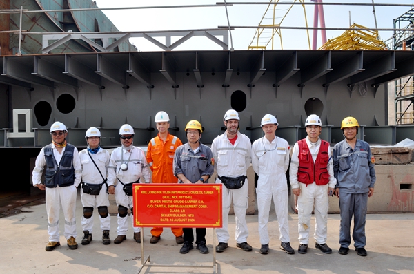 8月16日上午,公司在1#塢內(nèi)舉行船舶進塢合攏儀式,54#50000噸Ⅱ類化學(xué)品船、45#115000噸油船的船體結(jié)構(gòu)分段開始合攏搭載。常務(wù)副總經(jīng)理張玉永分別與新加坡船東EPS、希臘船東Capital代表分別出席活動。