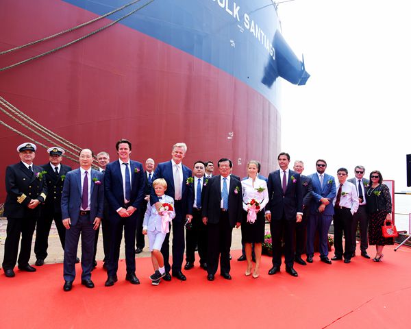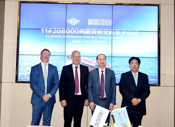 8月7日上午,公司隆重舉行命名儀式,為兩艘208000噸散貨船命名。董事長袁凱飛、總經理劉海金、常務副總經理張玉永,公司領導徐震宇、袁衡與挪威船東2020 BULKERS公司代表一起出席活動;顒由,11#、12#208000噸散貨船被命名為“BULK SANDEF JORD”、“BULK SANTIAGO” 號。