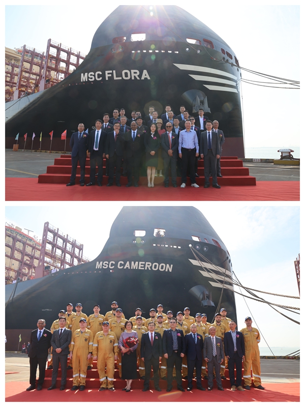 4月16日上午,公司舉行船舶命名儀式,1#11400箱、3#9#8100箱LNG雙燃料動力集裝箱船被分別命名為“MSC FLORA”“MSC CAMEROON”“MSC NAMIBIA”號。