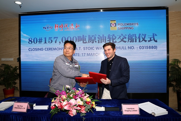 3月17日上午,公司舉行船舶簽字交付儀式,總經理劉海金、常務副總經理張玉永與希臘船東Polembros Shipping Limited代表出席活動,共同見證船舶簽字交付。